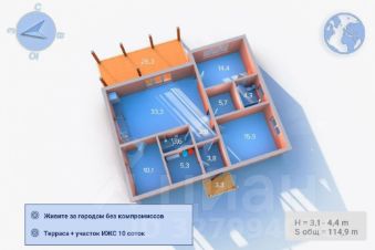 Планировка решена так, чтобы разделить общую и приватную части дома. Центральное пространство занимает кухня-гостиная площадью 33,3 м². Это основная зона жизни, где удобно собираться всей семьей, принимать гостей и организовать полноценную столовую и мягкую зону. За счет высоты потолков до 4,4 м помещение воспринимается объемным и светлым.