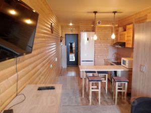 На первом этаже кухня со всей техникой и мебелью, и комната либо под спальню, либо под кабинет.