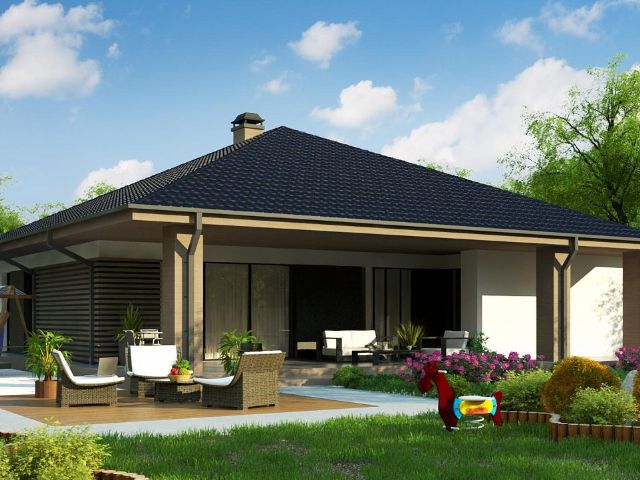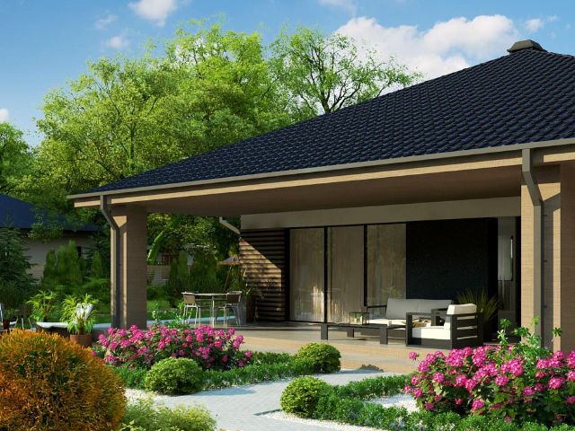Проект стильного одноэтажного дома с просторной крытой террасой