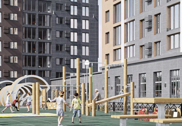 На территории комплекса размещены взрослые и детские спортивные зоны с надёжными тренажёрами, безопасные детские площадки в эко-стиле с резиновым амортизирующим покрытием и зонированием. Обустроены круглогодичные детские комнаты с отдельным входом, предназначенные для детей всех возрастов. Дворовая территория включает зелёные насаждения, тихие зоны отдыха, современные игровые и спортивные пространства, что делает её местом притяжения для жителей и гостей.