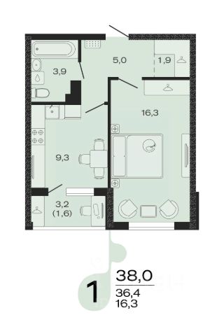 Продаётся 1-комнатная квартира в строящемся доме (Литер 3), срок сдачи: IV-кв. 2027, общей площадью 38 кв.м., на 1 этаже.
