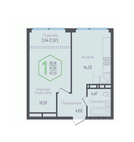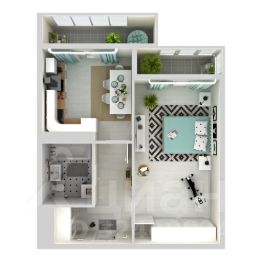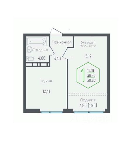 Квартира общей площадью 49,1 кв.м современной планировки, где прихожая 9,3 кв.м, совмещенный санузел 3,7 кв.м, комната 15 кв.м, кухня-гостиная 14,3 кв.м, ленточная лоджия 6,8 кв.м.