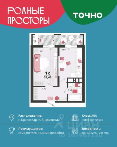 Район очень развит и для комфортной жизни тут все находится в шаговой доступности: школы и детские сады, поликлиники, фермерский рынок, Перекресток, Магнит, Пятерочка, торговые центры, ветеринарные клиники, детские обучающие центры, кафе и рестораны, академия ФК "Краснодар".