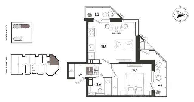 Квартира общей площадью 49,1 кв.м современной планировки, где прихожая 9,3 кв.м, совмещенный санузел 3,7 кв.м, комната 15 кв.м, кухня-гостиная 14,3 кв.м, ленточная лоджия 6,8 кв.м.