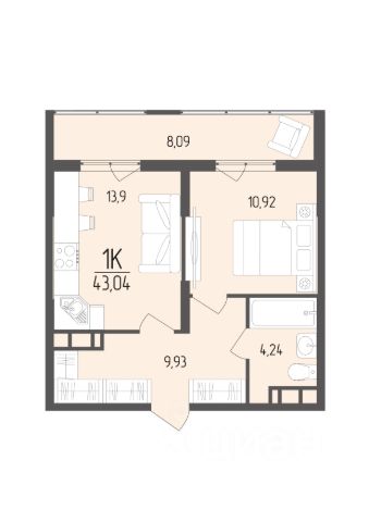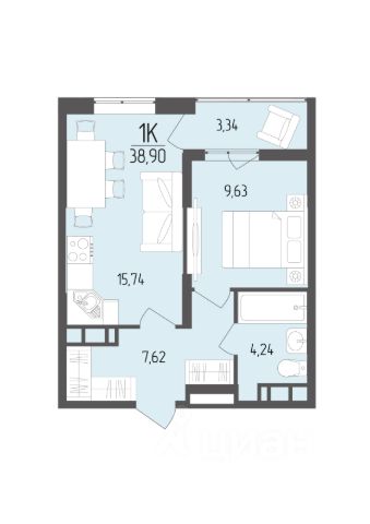 -Просторная комната площадью 26.3 кв.м с эркером, которая наполняет пространство светом и создаёт уютную атмосферу. Здесь достаточно места для размещения как зоны отдыха, так и рабочей области.