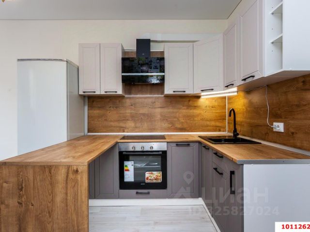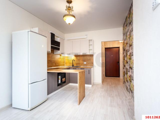 Угловая кухня выполнена под заказ, однотонные фасады шкафов AGT и под дерево EGGER , посудомоечная машина, холодильник, варочная поверхность, духовой шкаф, микроволновая печь. Столовая зона с круглым столом,стульями из натурального дерева. В комнате установлена сплит система Kentatsu (на площадь 35 кв.м). Большой угловой диван (260 см длинной) и подвесная ТВ консоль 260 см.