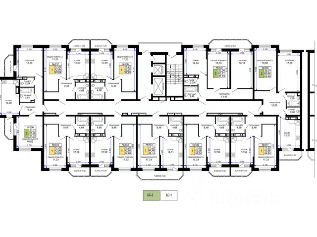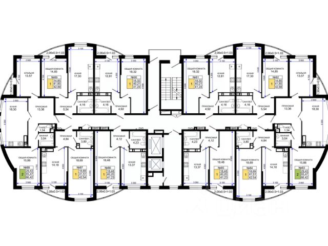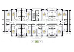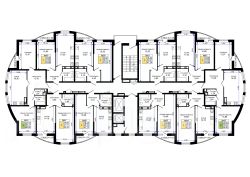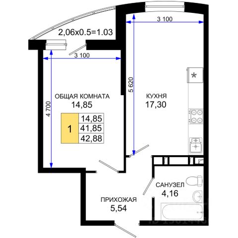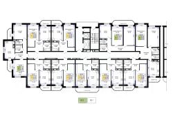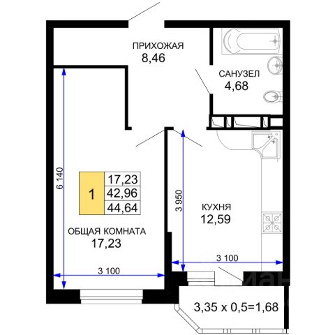 15 этаж: прихожая, санузел 3,49 м2., комната 14,03 м2., кухня 13,24 м2, лоджия 3,2 м2