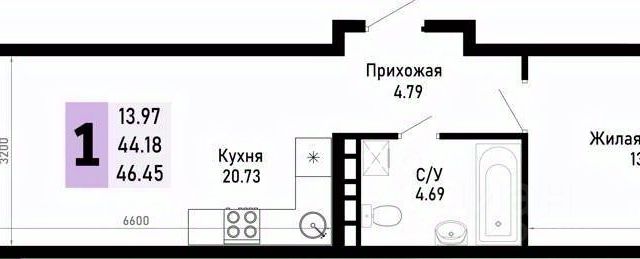 Продаётся 1-комнатная квартира в строящемся доме (квартал 7.1 литер 3), срок сдачи: IV-кв. 2026, общей площадью 44.46 кв.м., на 1 этаже. Новый жилой комплекс по ул. Николая Лебедева от застройщика "ССК"