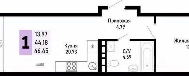 Продается 1-комн. квартира, площадью 46.45 м2. Возможен вариант покупки с использованием ипотечных средств. Жилая площадь 13.97 кв. м, кухня 20.73 кв. м, комнаты изолированные. Квартира располагается на 4 этаже 4-этажного монолитно-кирпичного дома, высота потолков 2.7 м. Дом оборудован пассажирским лифтом. Парковка автомобилей - наземная.