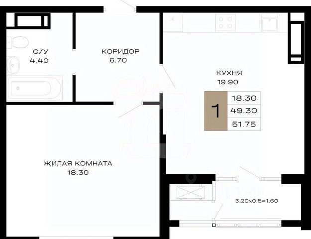 Общая площадь 37,3 м2.