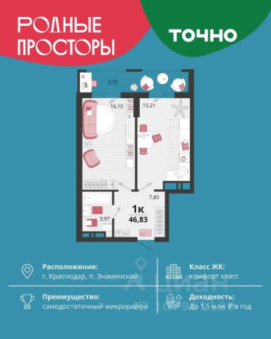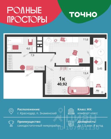 Продается квартира-студия в Жилом комплексе "Родные просторы"! В квартире выполнена качественная предчистовая отделка: Выровненные и подготовленные для отделки финишными материалами стены — улучшенная штукатурка стен. Подготовленный к укладке покрытия пол — стяжка пола. Коммуникации, выведенные в специальных местах в санузлах и кухонной зоне. Металлические входные двери с внутренней фрезеровкой и 2 замками. Металлопластиковые окна с долговечной фурнитурой. Радиаторы со встроенными терморегуляторами. Гидроизоляция пола санузлов. Крутая комплексная застройка территории с развитой инфраструктурой - на территории комплекса расположены школа на 1550 мест, 3 детских сада на 800 мест, поликлиника и частные клиники. На первых этажах домов расположены коммерческие помещения. Дворы свободны от автомобилей. Для автовладельцев предусмотрено более 2000 мест на открытых парковках по периметру микрорайона, и многоуровневые крытые наземные паркинги. Большая часть микрорайона оборудована пешеходными зонами и благоустроенными придомовыми территориями со спортивными площадками и большими детскими игровыми пространствами. Вся инфраструктура района находится в пешей доступности и располагаться внутри микрорайона. Рядом трасса М-4 - удобный выезд в сторону моря! Звоните прямо сейчас и покупайте квартиру в классном жилом комплексе!