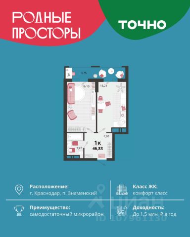Продается квартира-студия в Жилом комплексе "Родные просторы"! В квартире выполнена качественная предчистовая отделка: Выровненные и подготовленные для отделки финишными материалами стены — улучшенная штукатурка стен. Подготовленный к укладке покрытия пол — стяжка пола. Коммуникации, выведенные в специальных местах в санузлах и кухонной зоне. Металлические входные двери с внутренней фрезеровкой и 2 замками. Металлопластиковые окна с долговечной фурнитурой. Радиаторы со встроенными терморегуляторами. Гидроизоляция пола санузлов. Крутая комплексная застройка территории с развитой инфраструктурой - на территории комплекса расположены школа на 1550 мест, 3 детских сада на 800 мест, поликлиника и частные клиники. На первых этажах домов расположены коммерческие помещения. Дворы свободны от автомобилей. Для автовладельцев предусмотрено более 2000 мест на открытых парковках по периметру микрорайона, и многоуровневые крытые наземные паркинги. Большая часть микрорайона оборудована пешеходными зонами и благоустроенными придомовыми территориями со спортивными площадками и большими детскими игровыми пространствами. Вся инфраструктура района находится в пешей доступности и располагаться внутри микрорайона. Рядом трасса М-4 - удобный выезд в сторону моря! Звоните прямо сейчас и покупайте квартиру в классном жилом комплексе!