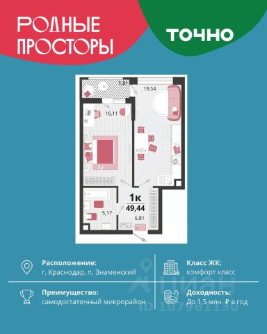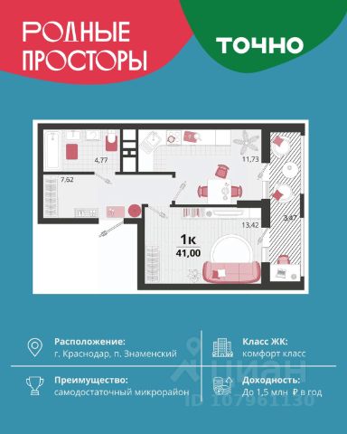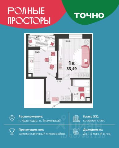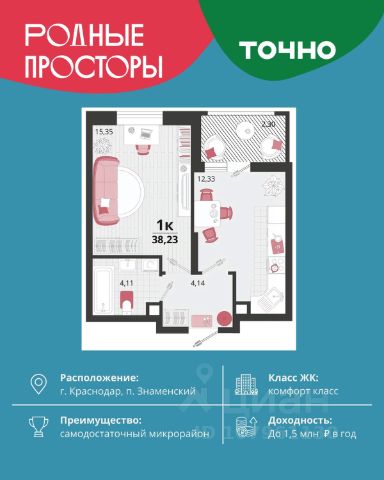 Продается квартира-студия в Жилом комплексе "Родные просторы"! В квартире выполнена качественная предчистовая отделка: Выровненные и подготовленные для отделки финишными материалами стены — улучшенная штукатурка стен. Подготовленный к укладке покрытия пол — стяжка пола. Коммуникации, выведенные в специальных местах в санузлах и кухонной зоне. Металлические входные двери с внутренней фрезеровкой и 2 замками. Металлопластиковые окна с долговечной фурнитурой. Радиаторы со встроенными терморегуляторами. Гидроизоляция пола санузлов. Крутая комплексная застройка территории с развитой инфраструктурой - на территории комплекса расположены школа на 1550 мест, 3 детских сада на 800 мест, поликлиника и частные клиники. На первых этажах домов расположены коммерческие помещения. Дворы свободны от автомобилей. Для автовладельцев предусмотрено более 2000 мест на открытых парковках по периметру микрорайона, и многоуровневые крытые наземные паркинги. Большая часть микрорайона оборудована пешеходными зонами и благоустроенными придомовыми территориями со спортивными площадками и большими детскими игровыми пространствами. Вся инфраструктура района находится в пешей доступности и располагаться внутри микрорайона. Рядом трасса М-4 - удобный выезд в сторону моря! Звоните прямо сейчас и покупайте квартиру в классном жилом комплексе!