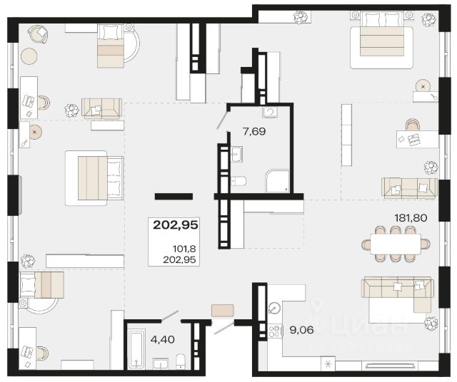 В квартире выполнен хороший и удобный ремонт: продуманное зонирование студийного пространства, что позволяет комфортно разместить зону отдыха, гостиную и кухню.