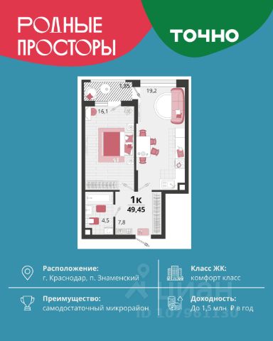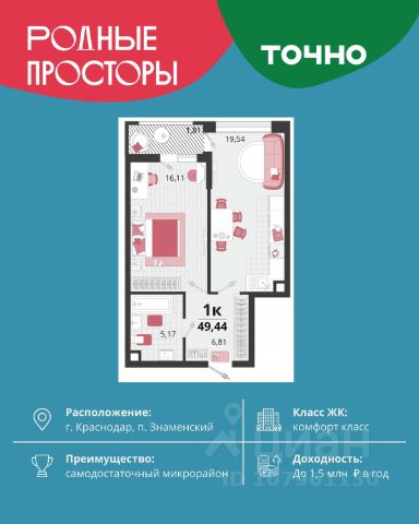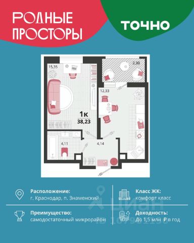 "Родные просторы"- самодостаточный микрорайон, который реализован по принципу комплексного развития территории, где есть вся инфраструктура для комфортной жизни. На территории 41 га 29 домов от 9 до 24 этажей, уютные дворы со спортивными и игровыми площадками, социальные и коммерческие объекты, зеленые массивы и фонтаны. Главная точка притяжения "Родных просторов" - парк семейного отдыха площадью 9 га, 4,5 км прогулочных аллей, амфитеатр для мероприятий, кинофестивальная площадка. Особая гордость микрорайона современная школа на 1550 мест и 3 детских сада "Ладушки", "Веснушки" и "Топотушки" на 880 малышей. В центре микрорайона строятся фитнес-клуб BALANCE с акватермальным комплексом и собственная поликлиника, площадью более 5000 кв.м. Уже открыт православный храм Святых Первоверховных апостолов Петра и Павла.