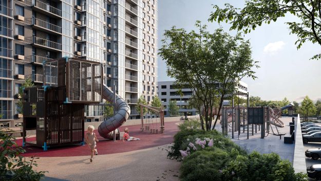 На территории комплекса выполнен ландшафтный дизайн: ухоженные газоны, цветочные клумбы и зоны отдыха. Предусмотрены современные детские площадки с безопасным покрытием и многофункциональные спортивные площадки, оснащенные профессиональными силовыми тренажерами. Рядом с подъездами установлены вело-парковки. Первый этаж дома занимают коммерческие помещения. Для владельцев автомобилей предусмотрен подземный паркинг.