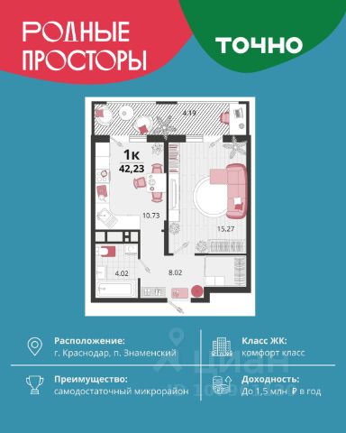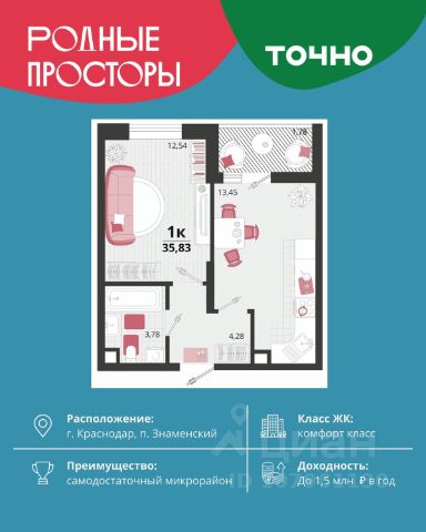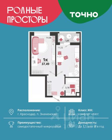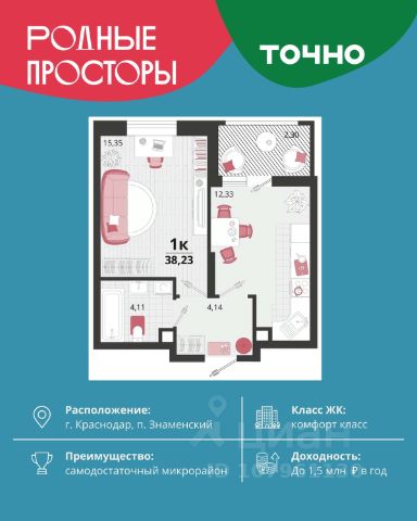 Продается квартира-студия в Жилом комплексе "Родные просторы"! В квартире выполнена качественная предчистовая отделка: Выровненные и подготовленные для отделки финишными материалами стены — улучшенная штукатурка стен. Подготовленный к укладке покрытия пол — стяжка пола. Коммуникации, выведенные в специальных местах в санузлах и кухонной зоне. Металлические входные двери с внутренней фрезеровкой и 2 замками. Металлопластиковые окна с долговечной фурнитурой. Радиаторы со встроенными терморегуляторами. Гидроизоляция пола санузлов. Крутая комплексная застройка территории с развитой инфраструктурой - на территории комплекса расположены школа на 1550 мест, 3 детских сада на 800 мест, поликлиника и частные клиники. На первых этажах домов расположены коммерческие помещения. Дворы свободны от автомобилей. Для автовладельцев предусмотрено более 2000 мест на открытых парковках по периметру микрорайона, и многоуровневые крытые наземные паркинги. Большая часть микрорайона оборудована пешеходными зонами и благоустроенными придомовыми территориями со спортивными площадками и большими детскими игровыми пространствами. Вся инфраструктура района находится в пешей доступности и располагаться внутри микрорайона. Рядом трасса М-4 - удобный выезд в сторону моря! Звоните прямо сейчас и покупайте квартиру в классном жилом комплексе!