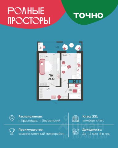 Продается квартира-студия в Жилом комплексе "Родные просторы"! В квартире выполнена качественная предчистовая отделка: Выровненные и подготовленные для отделки финишными материалами стены — улучшенная штукатурка стен. Подготовленный к укладке покрытия пол — стяжка пола. Коммуникации, выведенные в специальных местах в санузлах и кухонной зоне. Металлические входные двери с внутренней фрезеровкой и 2 замками. Металлопластиковые окна с долговечной фурнитурой. Радиаторы со встроенными терморегуляторами. Гидроизоляция пола санузлов. Крутая комплексная застройка территории с развитой инфраструктурой - на территории комплекса расположены школа на 1550 мест, 3 детских сада на 800 мест, поликлиника и частные клиники. На первых этажах домов расположены коммерческие помещения. Дворы свободны от автомобилей. Для автовладельцев предусмотрено более 2000 мест на открытых парковках по периметру микрорайона, и многоуровневые крытые наземные паркинги. Большая часть микрорайона оборудована пешеходными зонами и благоустроенными придомовыми территориями со спортивными площадками и большими детскими игровыми пространствами. Вся инфраструктура района находится в пешей доступности и располагаться внутри микрорайона. Рядом трасса М-4 - удобный выезд в сторону моря! Звоните прямо сейчас и покупайте квартиру в классном жилом комплексе!