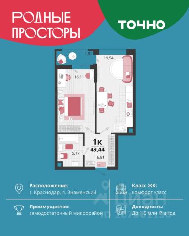 Продается квартира-студия в Жилом комплексе "Родные просторы"! В квартире выполнена качественная предчистовая отделка: Выровненные и подготовленные для отделки финишными материалами стены — улучшенная штукатурка стен. Подготовленный к укладке покрытия пол — стяжка пола. Коммуникации, выведенные в специальных местах в санузлах и кухонной зоне. Металлические входные двери с внутренней фрезеровкой и 2 замками. Металлопластиковые окна с долговечной фурнитурой. Радиаторы со встроенными терморегуляторами. Гидроизоляция пола санузлов. Крутая комплексная застройка территории с развитой инфраструктурой - на территории комплекса расположены школа на 1550 мест, 3 детских сада на 800 мест, поликлиника и частные клиники. На первых этажах домов расположены коммерческие помещения. Дворы свободны от автомобилей. Для автовладельцев предусмотрено более 2000 мест на открытых парковках по периметру микрорайона, и многоуровневые крытые наземные паркинги. Большая часть микрорайона оборудована пешеходными зонами и благоустроенными придомовыми территориями со спортивными площадками и большими детскими игровыми пространствами. Вся инфраструктура района находится в пешей доступности и располагаться внутри микрорайона. Рядом трасса М-4 - удобный выезд в сторону моря! Звоните прямо сейчас и покупайте квартиру в классном жилом комплексе!