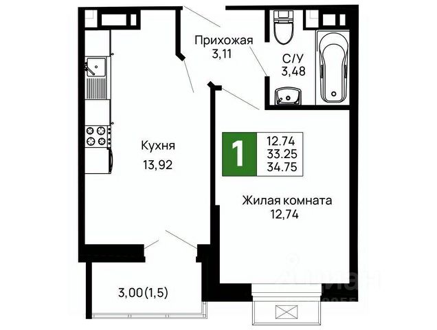 • Санузел под ключ: ванна с декоративным экраном, удобная раковина с пьедесталом, смесители, полотенцесушитель. На полу керамогранит.