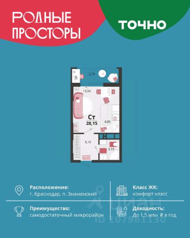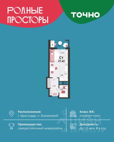 Продается квартира-студия в Жилом комплексе "Родные просторы"! В квартире выполнена качественная предчистовая отделка: Выровненные и подготовленные для отделки финишными материалами стены — улучшенная штукатурка стен. Подготовленный к укладке покрытия пол — стяжка пола. Коммуникации, выведенные в специальных местах в санузлах и кухонной зоне. Металлические входные двери с внутренней фрезеровкой и 2 замками. Металлопластиковые окна с долговечной фурнитурой. Радиаторы со встроенными терморегуляторами. Гидроизоляция пола санузлов. Крутая комплексная застройка территории с развитой инфраструктурой - на территории комплекса расположены школа на 1550 мест, 3 детских сада на 800 мест, поликлиника и частные клиники. На первых этажах домов расположены коммерческие помещения. Дворы свободны от автомобилей. Для автовладельцев предусмотрено более 2000 мест на открытых парковках по периметру микрорайона, и многоуровневые крытые наземные паркинги. Большая часть микрорайона оборудована пешеходными зонами и благоустроенными придомовыми территориями со спортивными площадками и большими детскими игровыми пространствами. Вся инфраструктура района находится в пешей доступности и располагаться внутри микрорайона. Рядом трасса М-4 - удобный выезд в сторону моря! Звоните прямо сейчас и покупайте квартиру в классном жилом комплексе!