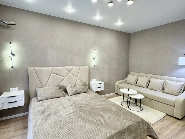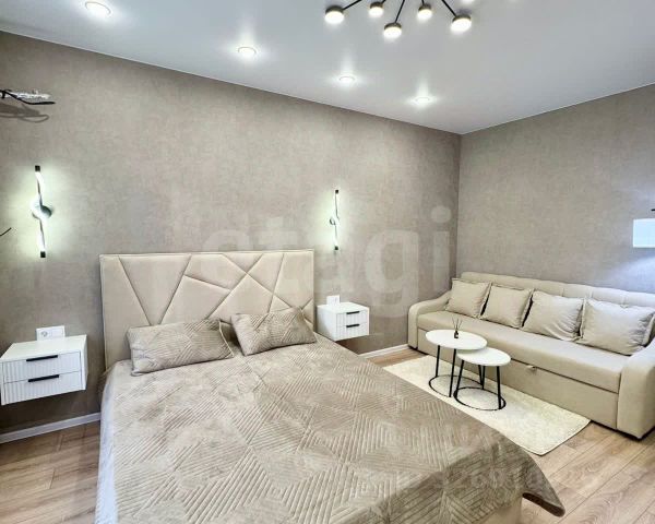 В квартире выполнен ремонт в светлых и спокойных тонах. Хорошая планировка с комнатой правильной прямоугольной формы и просторной кухней, в которой уже установлен кухонный гарнитуром. Санузел совмещен, установлена новая качественная сантехника. С комнаты есть выход на застекленную лоджию.