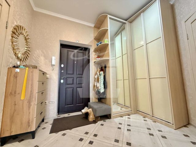 Внутри. Уютная светлая бежево-серая отделка стен и пола. Квартира полностью до мелочей оборудована для жизни. Остается вся мебель и техника (кроме детской кровати и школьного рабочего стола): встроенный угловой шкаф в прихожей, встроенный стеклянный вместительный шкаф в комнате, шкаф на балконе, кухонный гарнитур с бытовой техникой и посудомоечной машиной