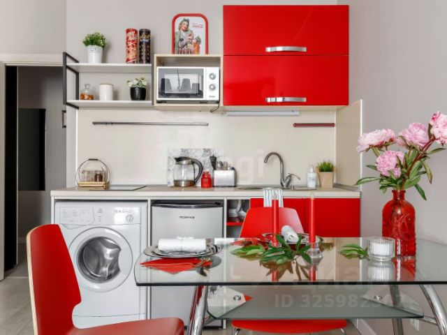 шкафы, кровать, диван, кухонный гарнитур, стол, микроволновая печь, холодильник, вытяжка, кондиционер, духовой шкаф и варочная поверхность, стиральная машина, водонагреватель. Установлена система подогрева воды на случай отсутствия горячей воды.