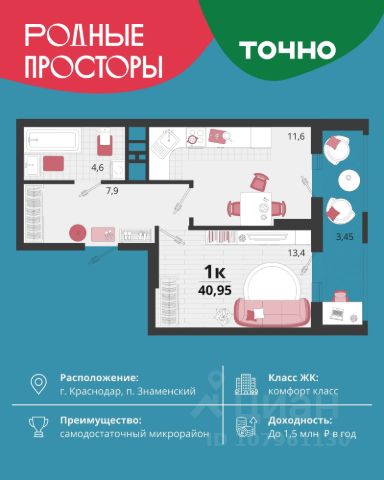 "Родные Просторы" — самодостаточный микрорайон, который реализуется по принципам комплексного развития территории. На территории 41 га возводится один из самых масштабных проектов в Краснодарском крае, который включает: 29 разновысотных домов_x000D_ от 9 до 24 этажей, уютные дворы со спортивными и игровыми площадками, социальные и коммерческие объекты, зеленые массивы и фонтаны. Главная точка притяжения "Родных Просторов" — парк семейного отдыха площадью 9 га, 4,5 км прогулочных аллей, амфитеатр для мероприятий, кинофестивальная площадка. Особая гордость микрорайона — современная школа на 1550 мест и 3 детских сада "Ладушки", "Веснушки" и "Топотушки" на 880 малышей. В центре микрорайона строятся фитнес-клуб "Баланс" с акватермальным комплексом и собственная поликлиника площадью более 5000 кв.м. Уже открыт православный храм Святых Первоверховных апостолов Петра и Павла. "Родные Просторы""— проект для жизни или инвестиций с доходом до 1,5 млн. руб. в год.*