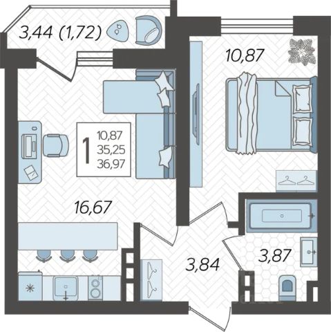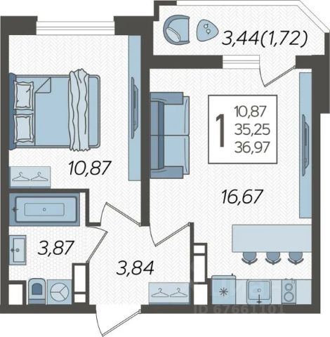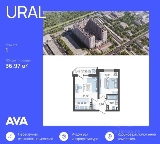 В новом жилом комплексе комфорт-класса продается 1-комнатная квартира площадью 36.97 кв. м, расположенная на 19 этаже. 23-этажный жилой комплекс URAL от девелопера AVA находится на улице Уральской, в районе с развитой инфраструктурой.