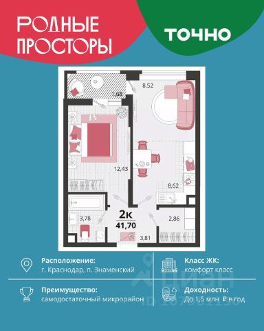 "Родные просторы"- самодостаточный микрорайон, который реализован по принципу комплексного развития территории, где есть вся инфраструктура для комфортной жизни. На территории 41 га 29 домов от 9 до 24 этажей, уютные дворы со спортивными и игровыми площадками, социальные и коммерческие объекты, зеленые массивы и фонтаны. Главная точка притяжения "Родных просторов" - парк семейного отдыха площадью 9 га, 4,5 км прогулочных аллей, амфитеатр для мероприятий, кинофестивальная площадка. Особая гордость микрорайона современная школа на 1550 мест и 3 детских сада "Ладушки", "Веснушки" и "Топотушки" на 880 малышей. В центре микрорайона строятся фитнес-клуб BALANCE с акватермальным комплексом и собственная поликлиника, площадью более 5000 кв.м. Уже открыт православный храм Святых Первоверховных апостолов Петра и Павла. Продается 2-комнатная квартира 40 м2 в Краснодаре.