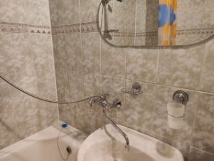 • Санузел под ключ: ванна с декоративным экраном, удобная раковина с пьедесталом, смесители, полотенцесушитель. На полу керамогранит.