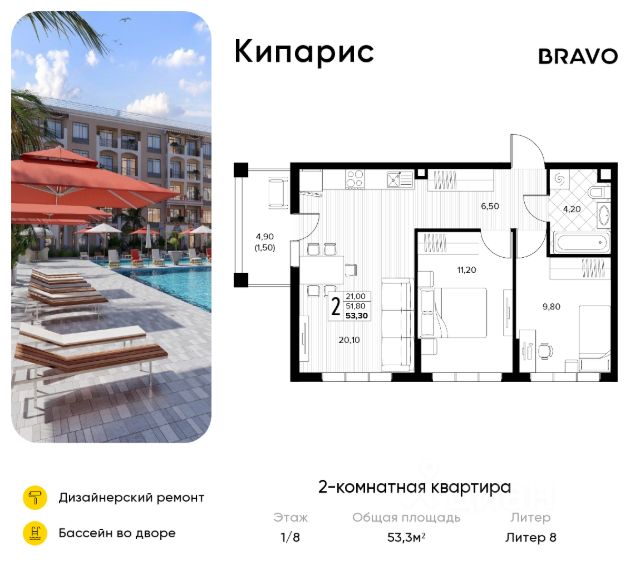 Продается 2-комнатная квартира площадью 53.60 кв. м без отделки, расположенная на 1 этаже, в новом жилом комплексе комфорт-класса "Кипарис". Прекрасный район, окруженный реликтовыми лесами и живописным рельефом гор. Адрес жилого комплекса - муниципальный округ Анапа, село Сукко, улица Мирная, дом 13. "Кипарис" - это жилой комплекс, где проявляется страсть к жизни. Здесь собраны все условия для активного отдыха, 19 бассейнов на территории, собственная развитая социальная инфраструктура и множество квартир с вдохновляющими пейзажами на долину Сукко. Транспортная доступность • Регулярный общественный транспорт для пешеходов • 3 км до Черного моря • Кипарисовое озеро в 7 минутах езды • 12 км до Анапы • 25 км до вокзала • 34 км до аэропорта Архитектура, вдохновленная побережьем моря В состав проекта "Кипарис" вошло 7 домов высотой от 4 до 8 этажей, архитектура которых вдохновлена стилем средиземноморского возрождения. Открытые балконы дают возможность быть ближе к природе. Уникальные террасы, мастер-спальни, просторные гардеробные, лоджии и окна с красивым видом - в планировках продумана каждая мелочь, что и формирует особое ощущение комфорта. Особое внимание в комплексе уделено созданию зон для отдыха и развлечений: на территории расположено 19 бассейнов, которые обеспечивают жителям возможность наслаждаться водными процедурами в любое время, создавая атмосферу курорта прямо у вас дома. Это идеальное место для семейного досуга, где можно расслабиться, позагорать или провести время с друзьями. Бассейны также оборудованы зонами для активных игр и отдыха, что делает "Кипарис" идеальным местом для тех, кто ценит комфорт и активный образ жизни. Насыщенное благоустройство Дом в долине Сукко - это не только бескрайние морские виды, зеленые леса и горы, не только полезный морской воздух, насыщенный ароматом краснокнижного можжевельника и сосен, но и также обширное благоустройство, где резидентам каждый день доступно все необходимое для комфортного отдыха. Во дворе каждого дома находится комплекс бассейнов, уютные шезлонги с зонтиками, изолированные детские и спортивные площадки, теннисные корты, зоны для пикников и барбекю. Двор закрыт от машин: за территорией комплекса предусмотрен паркинг на 3563 машино-места. Инфраструктура • Салоны красоты, кафе, магазины, аптеки на первых этажах; • Собственные детский сад на 200 мест и школа на 1100 мест; • Яхтинг, серфинг и дайвинг в шаговой доступности; • Винодельни, заповедники и достопримечательности в ближайшем окружении. Чтобы узнать подробности, обращайтесь за консультацией по телефону.