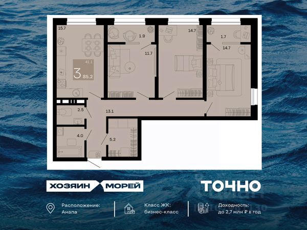 Жилой комплекс включает в себя корпуса высотой от 8 до 12 этажей. Дома возведены по качественной монолитной технологии строительства, с использованием комбинированных фасадов. В здании выполнена дизайнерская отделка входных групп и установлены современные скоростные лифты. В проекте предложено множество планировочных решений классического типа: от уютных студий до просторных 3-ех комнатных квартир. Сдаются они с подчистовой отделкой, панорамными окнами и высотой потолков 2,7 метра. Территория комплекса благоустроена и озеленена. Во дворе спроектированы безопасные детские и спортивные площадки с тренажерами и многофункциональными воркаут-комплексами, предусмотрены зоны отдыха и барбекю, а также зона для выгула собак. На территории комплекса возведена школа и 2 детских сада. Для владельцев автомобилей предусмотрен подземный паркинг. Жилой комплекс расположен в развитом районе города, где есть вся необходимая инфраструктура. Недалеко от комплекса располагаются торговые центры, аптеки, пункты выдачи заказов, школы, детские сады, а также поликлиники. До центра Анапы можно добраться за 10 минут транспортом.