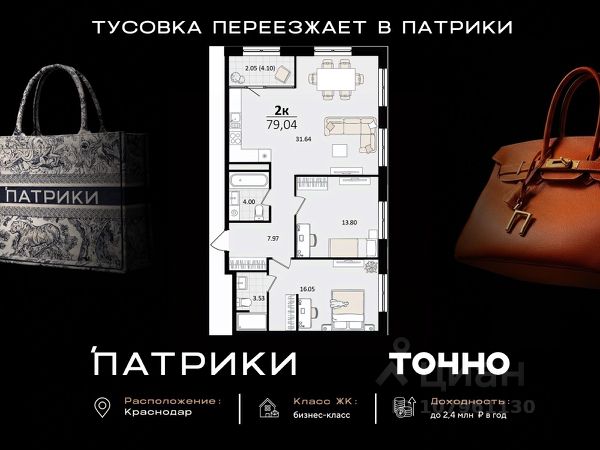 В продаже 2-комнатный апартамент 60.35 кв. м, расположенная в 4 корпусе жилого комплекса комфорт-класса "Режиссёр". Комплекс от девелопера AVA находится в развитом районе Краснодара, в 5 минутах пешком от крупного ТРЦ. Транспортная доступность • Остановка трамваев 8, 9, 10, 20 - в шаговой доступности; • 4 торговых центра в 5 минутах ходьбы; • 13 минут до живописного парка "Краснодар"; • 30 минут до аэропорта по Уральской улице; • Удобный выезд к морю через трассу М4. Современная архитектура Облик комплекса "Режиссёр" отражает современный стиль, отличающийся продуманной функциональностью. Устремленные ввысь 2 литера высотой от 14 до 21 этажа гармонируют с природным окружением комплекса - для отделки фасада подобраны лаконичные естественные оттенки. Балконы и лоджии панорамного типа с энергосберегающими стеклами не пропускают вредные УФ-лучи. Наслаждайтесь вдохновляющими видами на город без границ! Дизайнерские холлы Уют с первого шага: вас встретят входные группы с индивидуальным дизайном и комфортной мягкой мебелью для отдыха или ожидания такси. 2 скоростных лифта установлены в каждом подъезде и обеспечивают комфортное и быстрое перемещение по этажам. Кроме того, входные группы имеют безбарьерный доступ, что обеспечит удобство и безопасность для всех жителей. Двор и благоустройство Жилой комплекс "Режиссёр" отличается качественным многофункциональным зонированием двора, где каждый элемент благоустройства гармонично дополняет друг друга. Внутри комплекса находится две больших зелёных территории с детскими и спортивными площадками, фотозонами для красивых фотографий и протяженным прогулочным маршрутом. Большинство зон активности расположены на стилобате, что делает двор безопасным и уютным местом для отдыха. Преимущества • Трехуровневый подземный паркинг на 852 машино-места; • Всего 4 - 7 квартир на этаже; • Магазины, кафе и супермаркеты на первых этажах домов; • Школа, детский сад, поликлиника и парк в 5 - 10 минутах на машине.