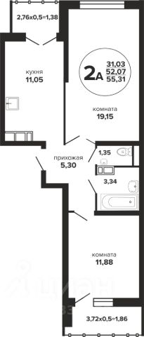 1) Кухня: длина 5,5 м., ширина 2,7 м., площадь 14,85 м.