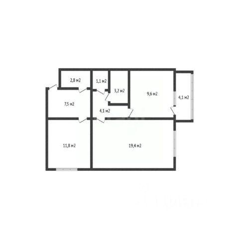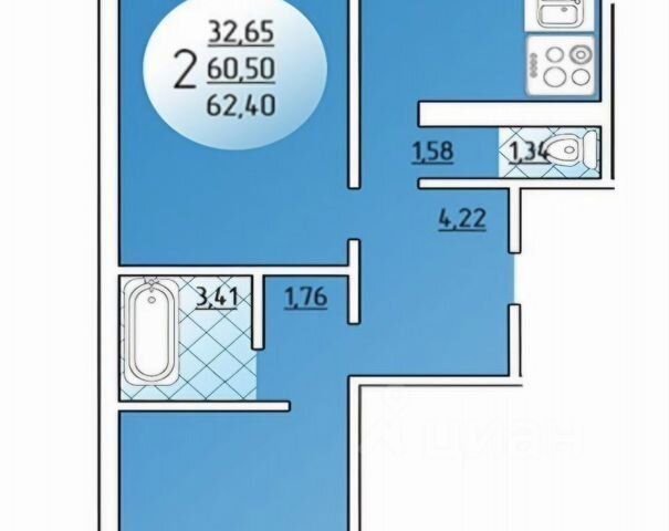 Площадь квартиры: 35,5 м², большая жилая комната: 19,7 м², санузел совмещенный 3 м², кухня 6,7 м².