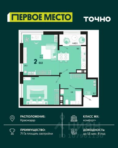 В продаже 2-комнатная квартира от застройщика! ЖК "Рекорд" 2 очередь, г. Краснодар, Литер 5 Срок сдачи: 4 кв. 2026, общей площадью 64.3 кв.м., на 14 этаже. Жилой Комплекс "РЕКОРД" - место вашего баланса. Город снаружи природа внутри. Квартал с максимумом возможностей для хорошо сбалансированной жизни. Расположен в оживленном благоустроенном районе города. Сочетает в себе и жилую застройку, и торгово-деловые центры. Здесь все под рукой, здесь центр городских событий. • Уникальная локация центр города • Современная архитектура • Панорамные виды • Двухуровневые квартиры с камином и террасой • Элегантные входные группы • Архитектурная подсветка фасадов • Школа во дворе (1550 мест) • Детский сад во дворе (110 мест) • Двор без машин • Подземный паркинг и гостевые парковки • Круглосуточный пост охраны • Медицинский центр • Фитнес центр • Система "умный дом" • Баскетбольная и универсальная спортивные площадки • Современные развивающие детские игровые площадки • Ресторанный дворик с аллеей и фонтаном • Храм с уникальной архитектурой • Премиальные лифты с подсветкой и музыкой • Звукоизоляционные окна • Зарядные устройства для электромобилей • Ароматизация мест общего пользования • Элегантные входные группы • Дизайнерские лобби • Консьерж сервис • Сквозные подъезды и доступ по Face ID • Кладовки • Кондиционирование холлов • Благоустройство территории с Арт объектом • Воркаут-зоны • Зона коворкинга • Wi-fi и USB розетки на всей территории двора Приобрести квартиру можно одним из способов: -субсидированная семейная ипотека 4,5 % на весь срок -рассрочка до конца строительства -оплата наличными -дистанционная покупка Позвоните сейчас и забронируйте квартиру со скидкой!