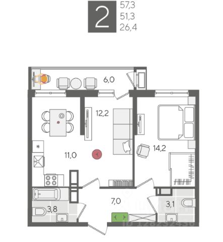 Квартира расположена на 14 этаже 20-этажного монолитно-кирпичного дома. Общая площадь квартиры по выписке ЕГРН составляет 65,9 кв. м, с балконом площадь -69,4, площадь балкона составляет - 3,5 кв м. Площадь машиноместа - 17,4 кв.м