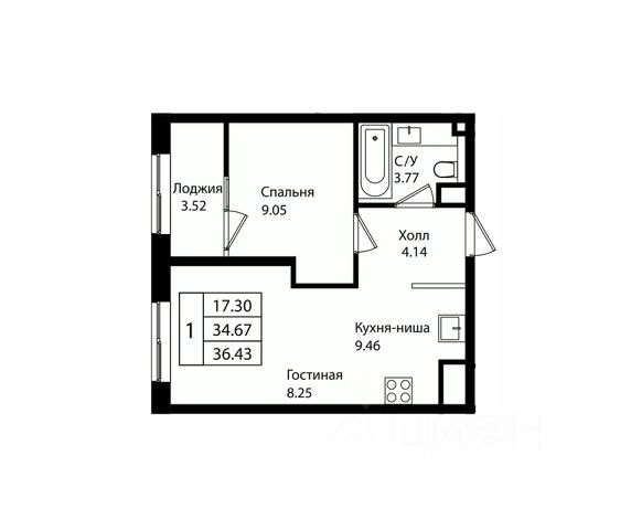 Просторная Кухня-гостиная составляет 11,90 м2.