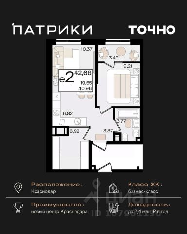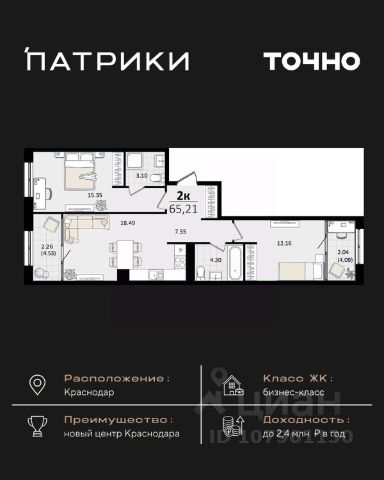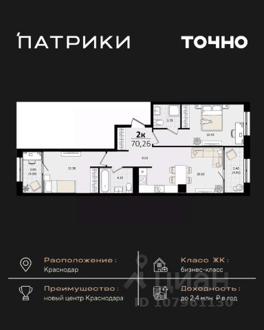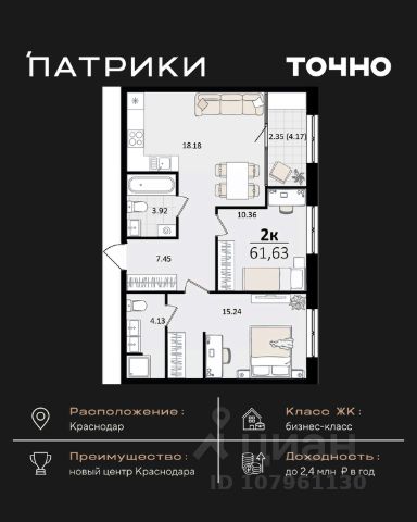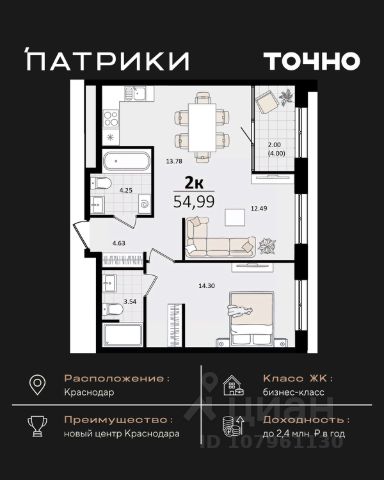 Продаётся двухкомнатная квартира в ЖК "Галактика" в Краснодаре Адрес: Уральская улица, дом 71, Карасунский район. Квартира расположена на 15 этаже 24-этажного монолитно-кирпичного дома, построенного в 2021 году. Высота потолков составляет 2,8 метра, что создаёт ощущение простора и свободы. Общая площадь квартиры — 57,3 кв. м, жилая площадь — 35 кв. м, площадь кухни — 11 кв. м. Планировка Квартира имеет изолированную планировку, что обеспечивает комфорт и уединение. Лоджия застеклена, из окон открывается вид на улицу. Состояние Квартира в отличном состоянии, готова к проживанию. Коммуникации В квартире центральное отопление. В доме установлены пассажирский и грузовой лифты. Дополнительные удобства На территории ЖК есть закрытая территория, детская и спортивная площадки. Документы Квартира находится в собственности более 5 лет. Возможна покупка в ипотеку, с использованием материнского капитала или военной ипотеки. Особенности Квартира оснащена стеклопакетами и железной дверью.
