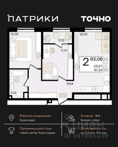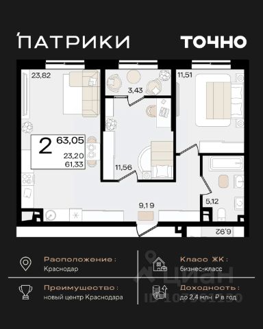 Продаётся 2-комнатная квартира в строящемся доме (Дом 100/6), срок сдачи: I-кв. 2026, общей площадью 83.27 кв.м., на 5 этаже. Новый жилой комплекс "Альфа" от застройщика "Телекомстрой" расположен по адресу город Краснодар, Уральская улица.
