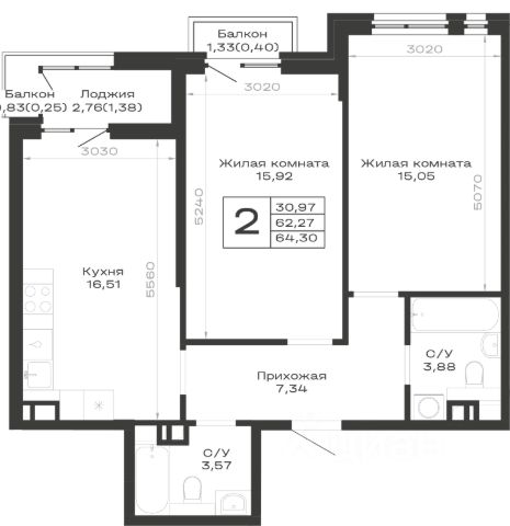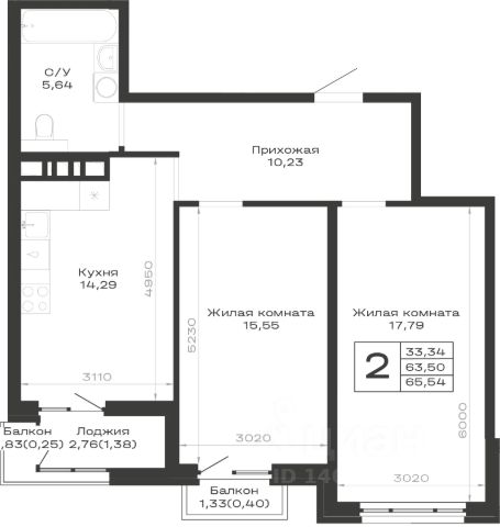 Продаётся 2-комнатная квартира в сданном доме (Корпус 1), срок сдачи: IV-кв. 2024, общей площадью 55.36 кв.м., на 6 этаже.