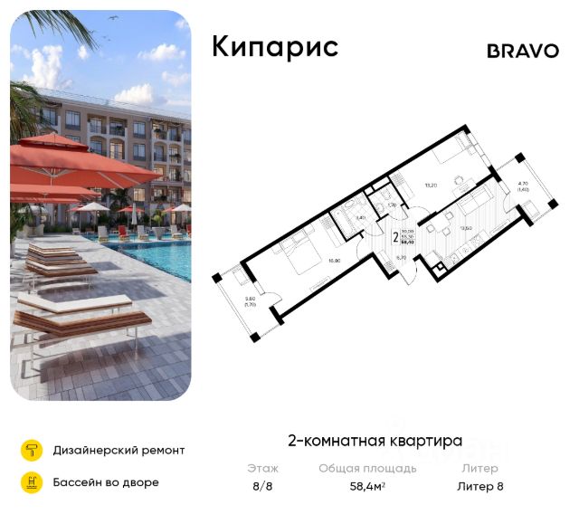 Продается 2-комнатная квартира площадью 53.50 кв. м без отделки, расположенная на 8 этаже, в новом жилом комплексе комфорт-класса "Кипарис". Прекрасный район, окруженный реликтовыми лесами и живописным рельефом гор. Адрес жилого комплекса - муниципальный округ Анапа, село Сукко, улица Мирная, дом 13. "Кипарис" - это жилой комплекс, где проявляется страсть к жизни. Здесь собраны все условия для активного отдыха, 19 бассейнов на территории, собственная развитая социальная инфраструктура и множество квартир с вдохновляющими пейзажами на долину Сукко. Транспортная доступность • Регулярный общественный транспорт для пешеходов • 3 км до Черного моря • Кипарисовое озеро в 7 минутах езды • 12 км до Анапы • 25 км до вокзала • 34 км до аэропорта Архитектура, вдохновленная побережьем моря В состав проекта "Кипарис" вошло 7 домов высотой от 4 до 8 этажей, архитектура которых вдохновлена стилем средиземноморского возрождения. Открытые балконы дают возможность быть ближе к природе. Уникальные террасы, мастер-спальни, просторные гардеробные, лоджии и окна с красивым видом - в планировках продумана каждая мелочь, что и формирует особое ощущение комфорта. Особое внимание в комплексе уделено созданию зон для отдыха и развлечений: на территории расположено 19 бассейнов, которые обеспечивают жителям возможность наслаждаться водными процедурами в любое время, создавая атмосферу курорта прямо у вас дома. Это идеальное место для семейного досуга, где можно расслабиться, позагорать или провести время с друзьями. Бассейны также оборудованы зонами для активных игр и отдыха, что делает "Кипарис" идеальным местом для тех, кто ценит комфорт и активный образ жизни. Насыщенное благоустройство Дом в долине Сукко - это не только бескрайние морские виды, зеленые леса и горы, не только полезный морской воздух, насыщенный ароматом краснокнижного можжевельника и сосен, но и также обширное благоустройство, где резидентам каждый день доступно все необходимое для комфортного отдыха. Во дворе каждого дома находится комплекс бассейнов, уютные шезлонги с зонтиками, изолированные детские и спортивные площадки, теннисные корты, зоны для пикников и барбекю. Двор закрыт от машин: за территорией комплекса предусмотрен паркинг на 3563 машино-места. Инфраструктура • Салоны красоты, кафе, магазины, аптеки на первых этажах; • Собственные детский сад на 200 мест и школа на 1100 мест; • Яхтинг, серфинг и дайвинг в шаговой доступности; • Винодельни, заповедники и достопримечательности в ближайшем окружении. Чтобы узнать подробности, обращайтесь за консультацией по телефону.
