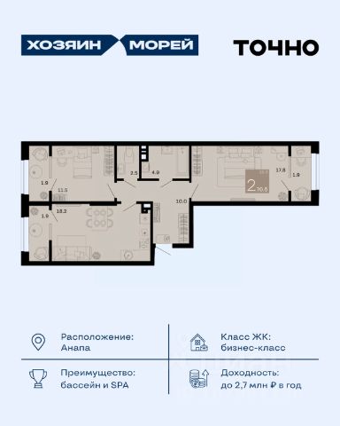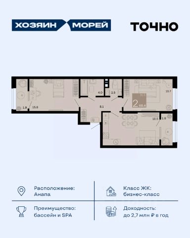 Жилой комплекс включает в себя корпуса высотой от 8 до 12 этажей. Дома возведены по качественной монолитной технологии строительства, с использованием комбинированных фасадов. В здании выполнена дизайнерская отделка входных групп и установлены современные скоростные лифты. В проекте предложено множество планировочных решений классического типа: от уютных студий до просторных 3-ех комнатных квартир. Сдаются они с подчистовой отделкой, панорамными окнами и высотой потолков 2,7 метра. Территория комплекса благоустроена и озеленена. Во дворе спроектированы безопасные детские и спортивные площадки с тренажерами и многофункциональными воркаут-комплексами, предусмотрены зоны отдыха и барбекю, а также зона для выгула собак. На территории комплекса возведена школа и 2 детских сада. Для владельцев автомобилей предусмотрен подземный паркинг. Жилой комплекс расположен в развитом районе города, где есть вся необходимая инфраструктура. Недалеко от комплекса располагаются торговые центры, аптеки, пункты выдачи заказов, школы, детские сады, а также поликлиники. До центра Анапы можно добраться за 10 минут транспортом.