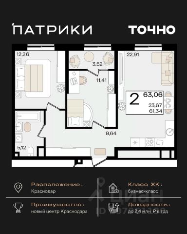 Продаются 2-комнатные апартаменты в сданном доме (Дом 75/6), срок сдачи: II-кв. 2023, общей площадью 48.8 кв.м., на 9 этаже. Апарт-отель The Grand Palace - новая точка притяжения на карте Краснодара. Проект формирует особенный облик деловой части города и вдохновляет его жителей. Апарт-отель - это новый для Краснодара формат жилья, где можно постоянно жить в более комфортных, чем в обычном доме условиях самому и с семьей или купить готовые апартаменты с ремонтом в качестве инвестиции для сдачи в красткосрочную или долгосрочную аренду. От обычного жилого комплекса апарт-отель отличает собственная внутренняя инфраструктура. Резидентам апартаментов доступны услуги зоны SPA и фитнеса, медицинского консьержа, ресторана авторской кухни, прачечной и клининга, коворкинга и лобби-бара. Все апартаменты продаются с ремонтом под ключ! Единый архитектурный стиль и продуманный до мелочей дизайн всех помещений и апартаментов надолго останется актуальным. Инфраструктура - На расстоянии менее 1 км. находятся крупнейшие торгово-развлекательные центры : СБС Мегамолл с кинотеатром, ресторанами, кафе, ТРК Галактика. - Рядом 2 premium фитнес-центра с бассейнами 50 GYM и X-FIT - 10 минут пешком. - Удачный район не только для отдыха, но и бизнеса: с оптовыми базами, офисными центрами, складскими помещениями. - Удобная транспортная развязка с выездом в любой район города, аэропорт и на трассу М4 к морю. - Множество остановок общественного транспорта, в том числе маршруток и трамвая в любой конец города. 15 минут пешком до детского сада и школы 24 Всё это обеспечит повышенный интерес и постоянный спрос на апартаменты, что гарантирует стабильный доход от рентабельной недвижимости в Краснодаре, цена на которую будет только расти.