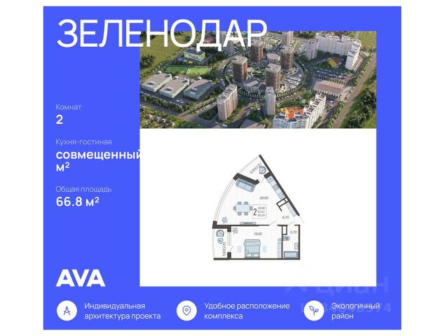 В зеленом экологически чистом пригороде Краснодара продается 2-комнатная квартира площадью 66.8 кв. м с чистовой отделкой. Квартира расположена на 9 этаже, в жилом комплексе комфорт-класса "Зеленодар" от AVA. "Зеленодар" - это современная и эстетичная архитектура, квартиры с удобной планировкой, зоны отдыха с газонами и зелеными насаждениями, спортивные площадки, безопасные дворы и 3 многоуровневые парковки по 500 мест. Уникальное место в окружении природы для здоровой и комфортной жизни! Окружение и транспортная доступность • 2 остановки общественного транспорта в 5 минутах ходьбы; • Клуб отдыха с открытым бассейном в 5 минутах езды; • Крупный ТРЦ "Красная площадь" в 10 минутах езды; • Удобный выезд на Ейское шоссе, идущее в сторону Черного моря. Стильная и функциональная архитектура Лаконичный фасад каждого дома дополняет панорамное остекление и блоки под кондиционеры, которые не только выполняют декоративную функцию, а также позволяют освободить квартиры от оборудования. Многофункциональные подъезды с дизайнерским оформлением оснащены пандусами для маломобильных жителей, внутри установлены скоростные лифты - все для комфорта жильцов. Благоустройство В жилом комплексе уже созданы все условия для увлекательного досуга: спортивные площадки с безопасным покрытием, площадки для малышей с песочницами, качелями и горками из натуральных материалов, бульвары для вечерних прогулок, дорожки для бега и поездок на велосипеде. Внутри района много взрослых деревьев, аллей и газонов, благодаря чему территория "Зеленодара" становится еще более уютной. Собственная инфраструктура Для удобства жителей "Зеленодара" на первых этажах расположатся коммерческие помещения с продуктовыми магазинами, кафе, салонами красоты и детскими школами развития. Другие преимущества • Все дома уже построены и сданы; • Интернет-кабель, домофон, индивидуальные приборы учета тепла и воды уже установлены в каждой квартире; • Супермаркеты, поликлиника, детский сад, школа и ресторан в шаговой доступности.