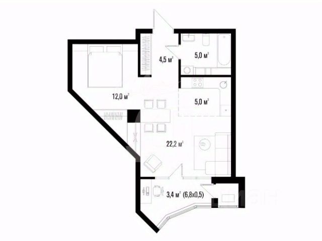 шкафы, кровать, диван, кухонный гарнитур, стол, микроволновая печь, холодильник, вытяжка, кондиционер, духовой шкаф и варочная поверхность, стиральная машина, водонагреватель. Установлена система подогрева воды на случай отсутствия горячей воды.