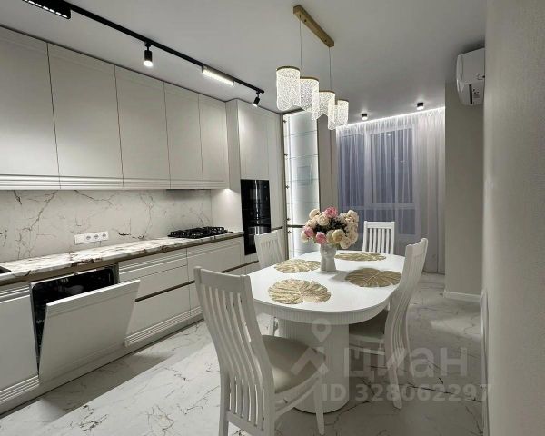 Кухня: гарнитур с качественными доводчиками и встроенной техникой (варочная панель, вытяжка, духовой шкаф, посудомоечная машина, холодильник, микроволновая печь), обеденная группа, кондиционер