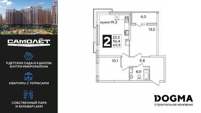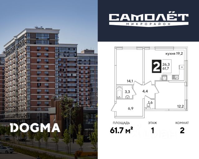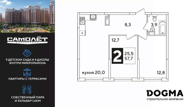 DOGMA - ТОП-3 застройщик по объему строительства в РФ. "САМОЛЁТ" — концептуальный жилой микрорайон, который расположен на северо-западе Краснодара, в районе Западного Обхода. Квартал спроектирован как "город в городе", поэтому здесь будет всё для комфортной жизни: современные дома с разными планировками, дороги, школы и детские сады, поликлиника, торговые центры, парки и аллеи. Микрорайон находится далеко от промышленных предприятий, сочетает удобство городской жизни и экологически благоприятную среду. Инфраструктура нового микрорайона: • 4 школы и 9 детских садов на территории микрорайона • Функциональные планировки • Собственный бульвар протяжённостью 1,6км • Светомузыкальный фонтан протяжённостью 55 метров • Амфитеатр • Парк 7 ГА • Скейт-парк • Детская аква-площадка • Круглосуточное видеонаблюдение и пост охраны Приобрести квартиру можно одним из способов: ипотека, рассрочка, наличный расчет.